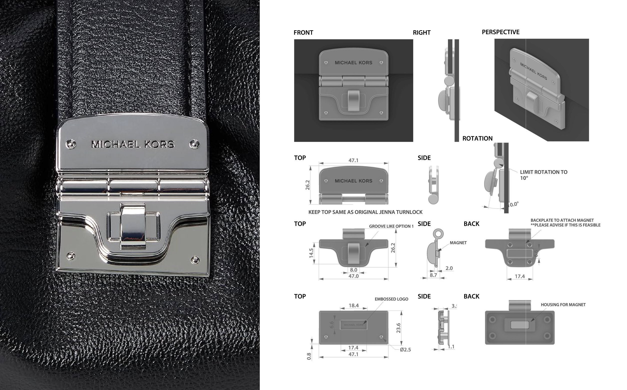 Revitalized a vintage Michael Kors functional bag lock by modernizing its design language while significantly reducing hardware costs. The redesigned Addie Lock maintains the iconic visual charm of the original while introducing improved functionality and manufacturing efficiency. The updated lock is currently in production across the Addie Shoulder Bag and Addie Crossbody Bag collections.