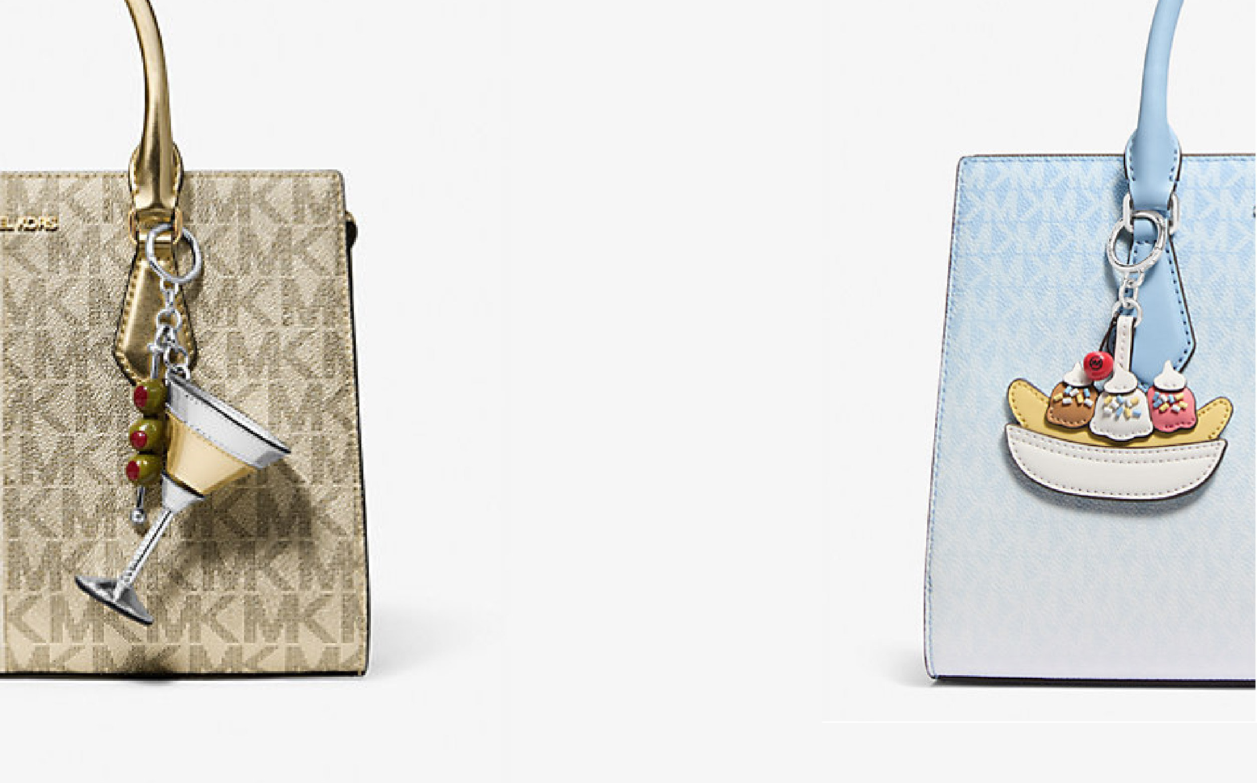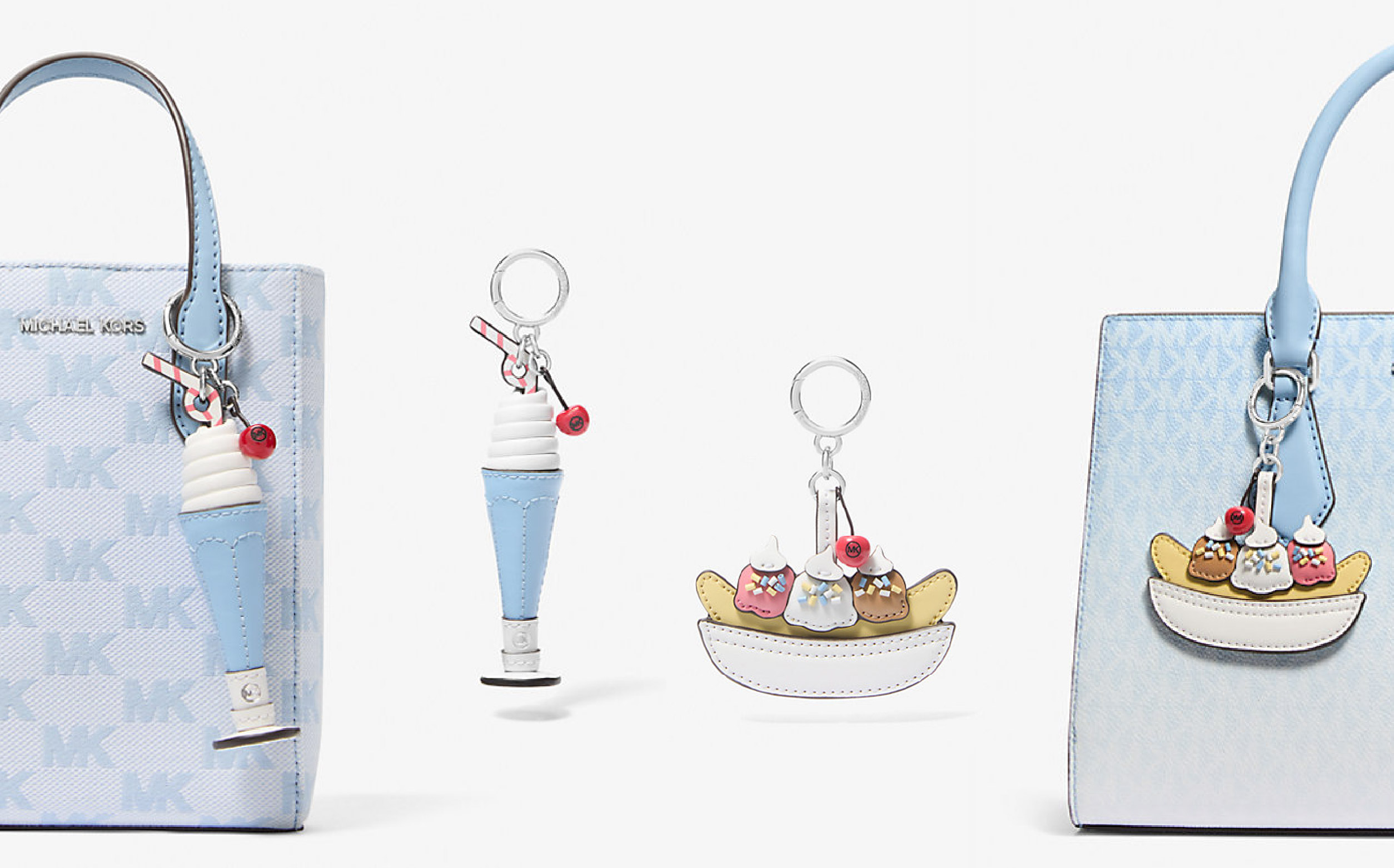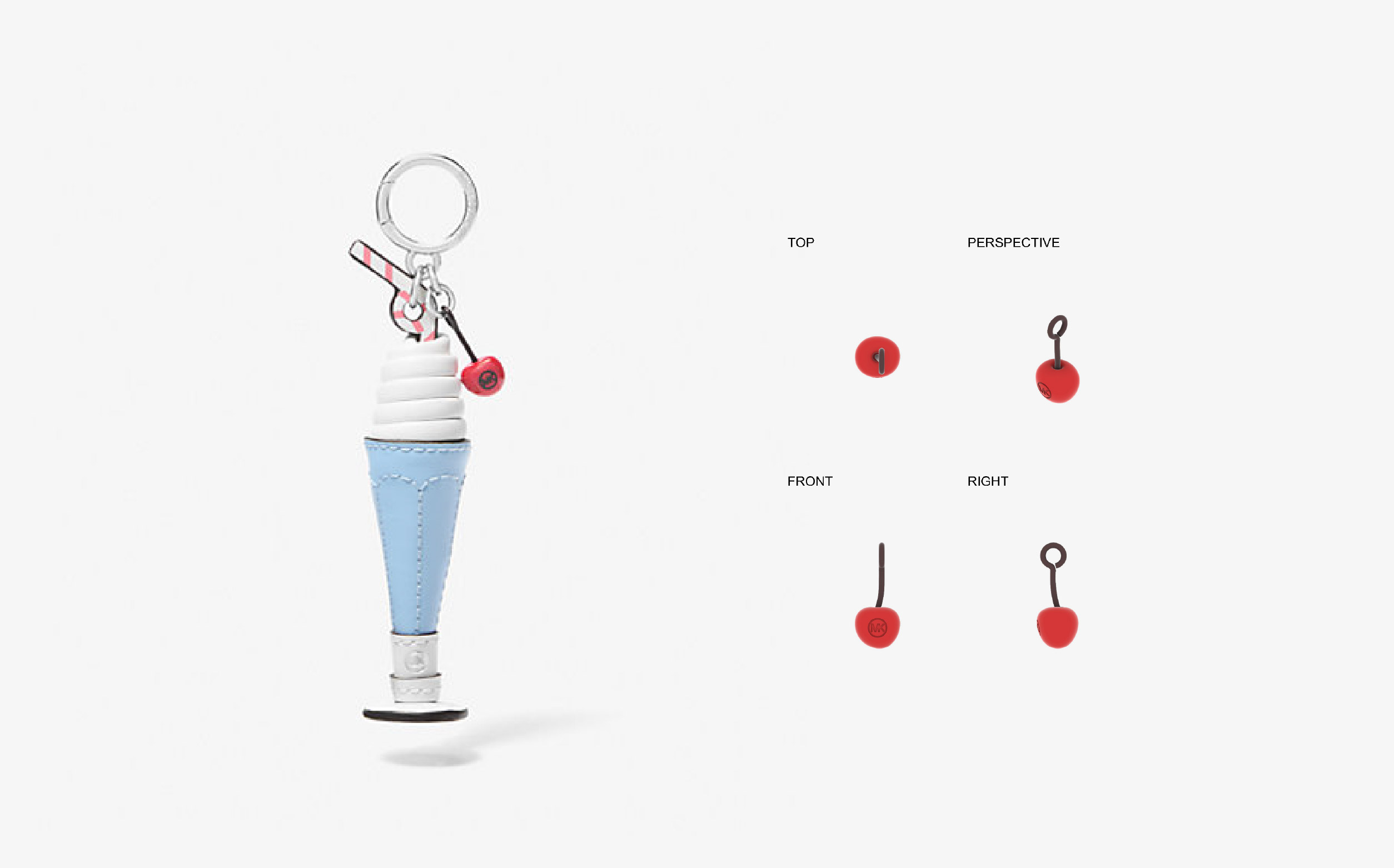 Cherry & Ice Cream Charm SetA playful novelty piece combining a removable dog-clip charm mechanism with a resin cherry accent featuring the MK logo. The removable clip allows the charm to function as a versatile keyfob, while the complementary leather construction adds tactile sophistication and brand consistency.