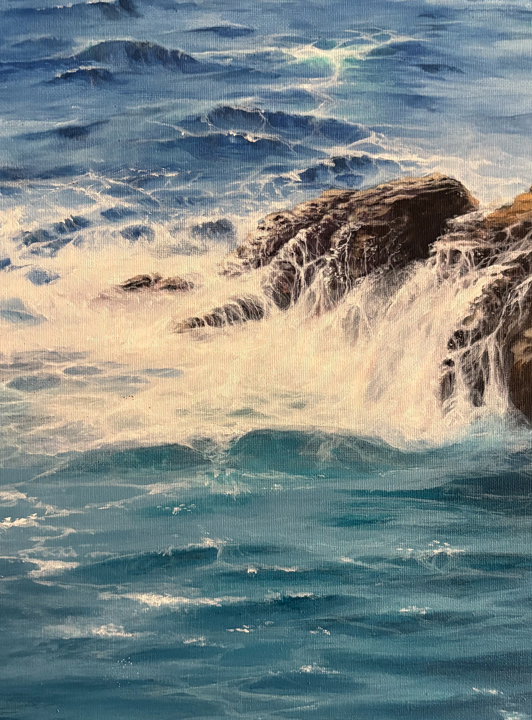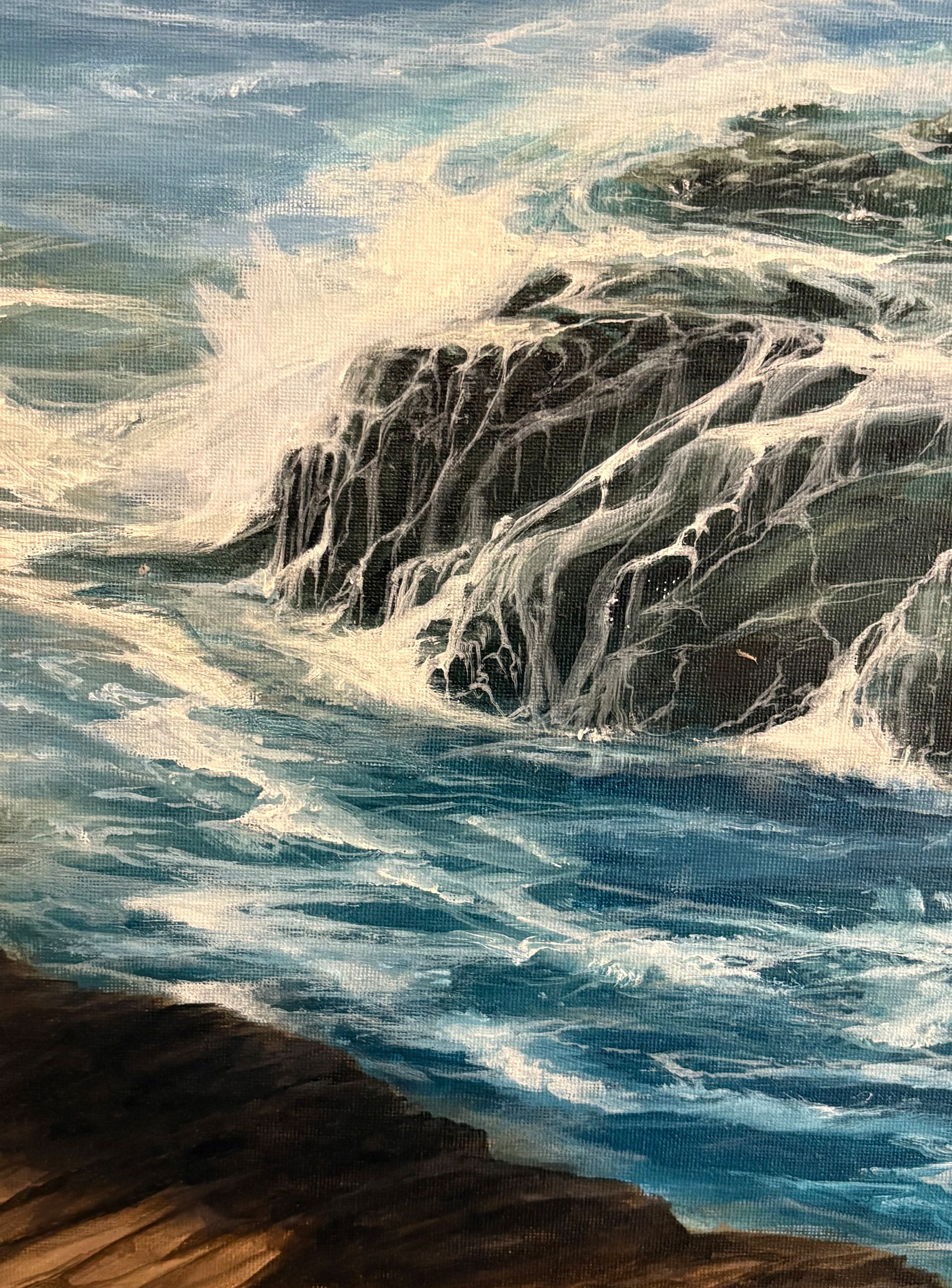 Fishermen rest on weathered stone, their silhouettes small against the endless blue. The waves crash and retreat with ancient rhythm, sending spray across rocks worn smooth by countless tides. Above, gulls glide with wings catching light like silver against the Mediterranean sky.